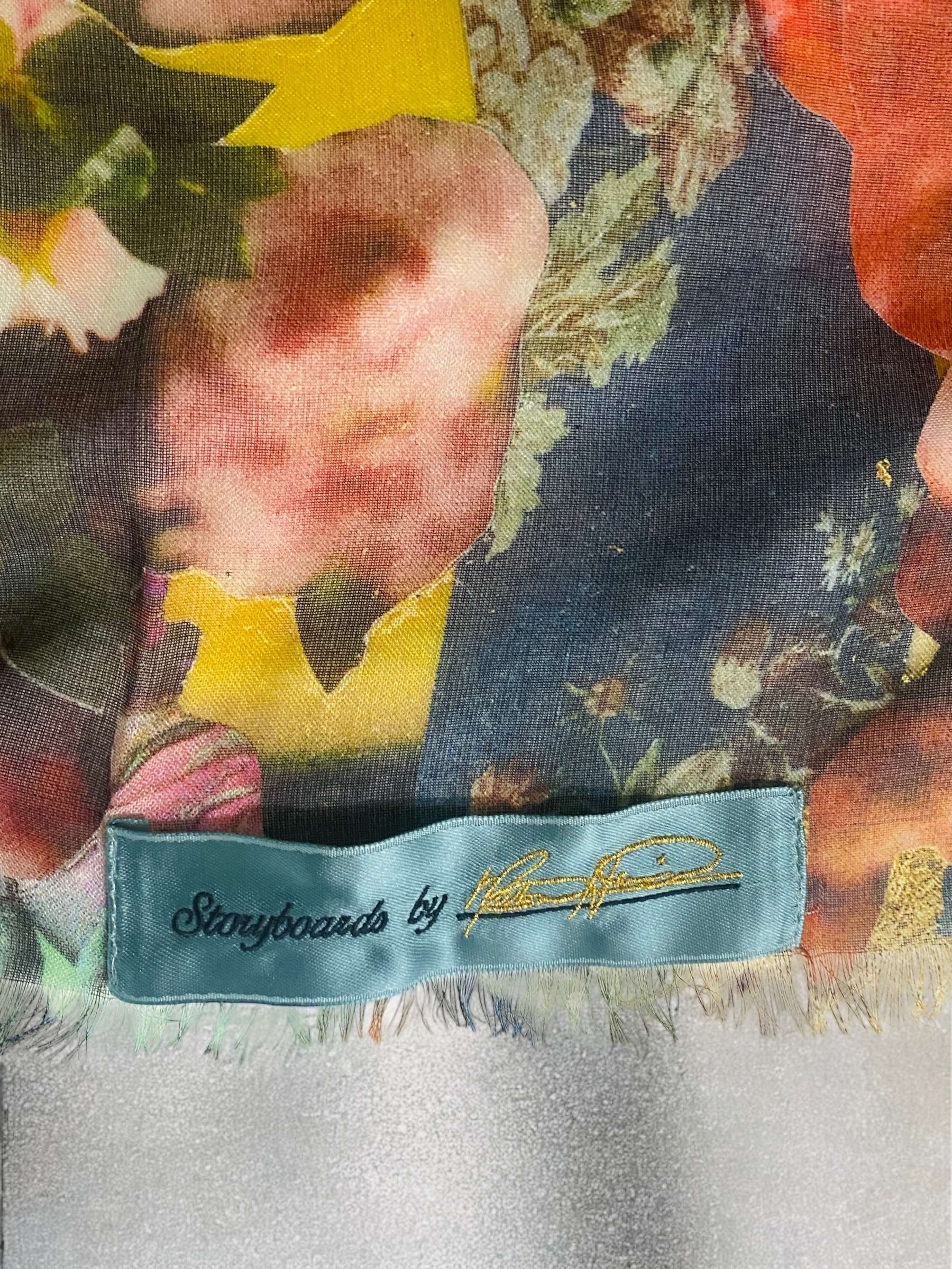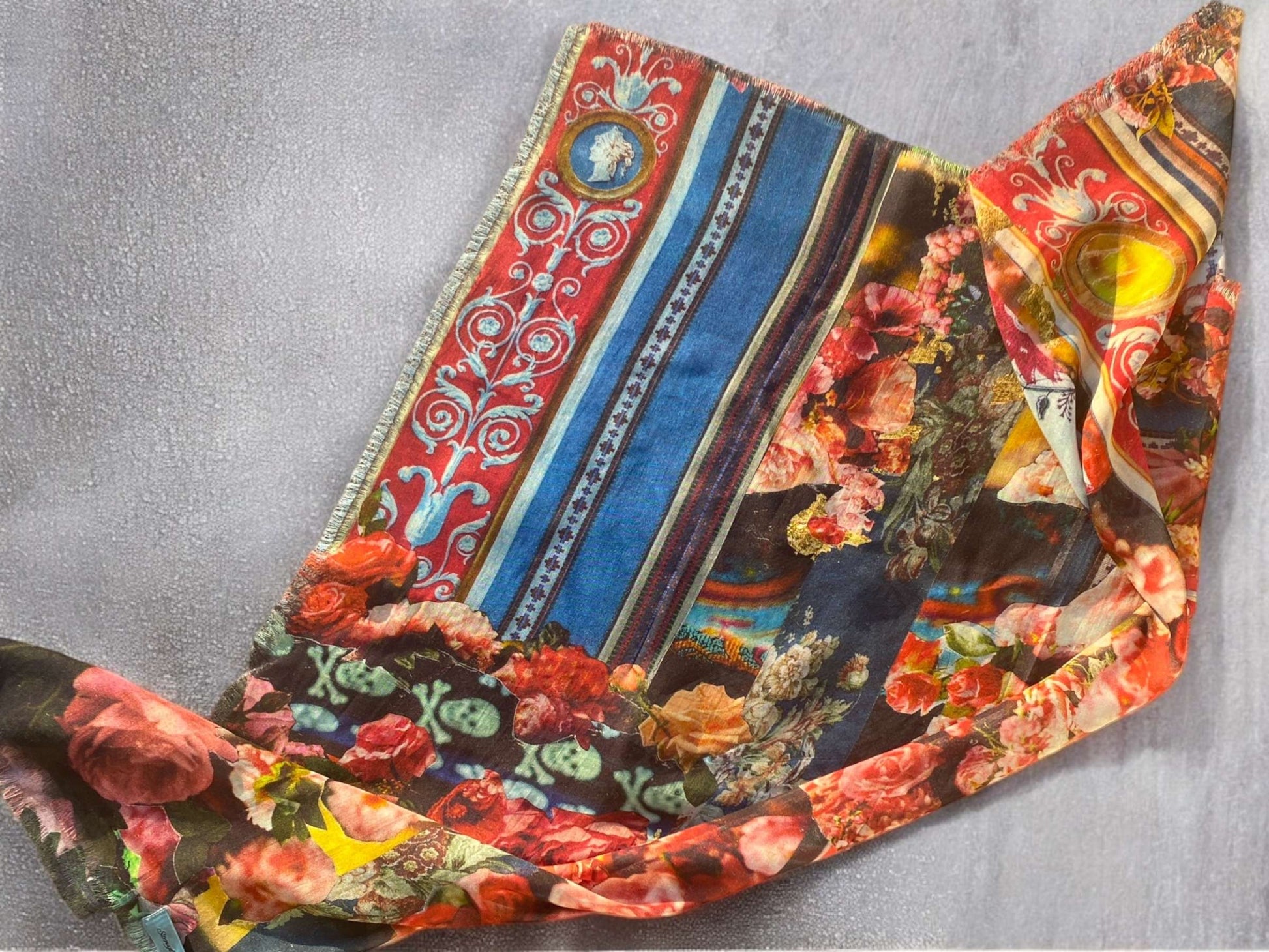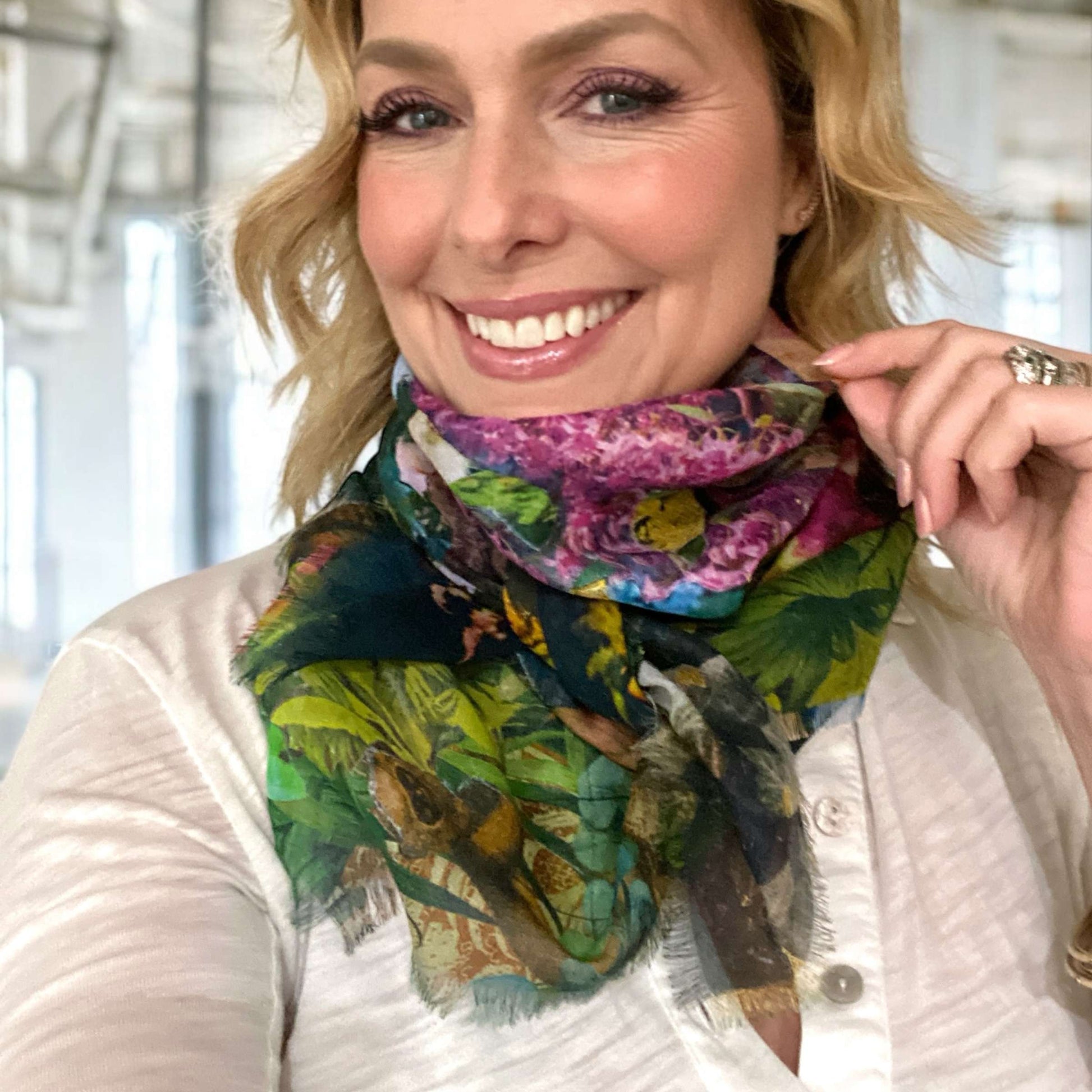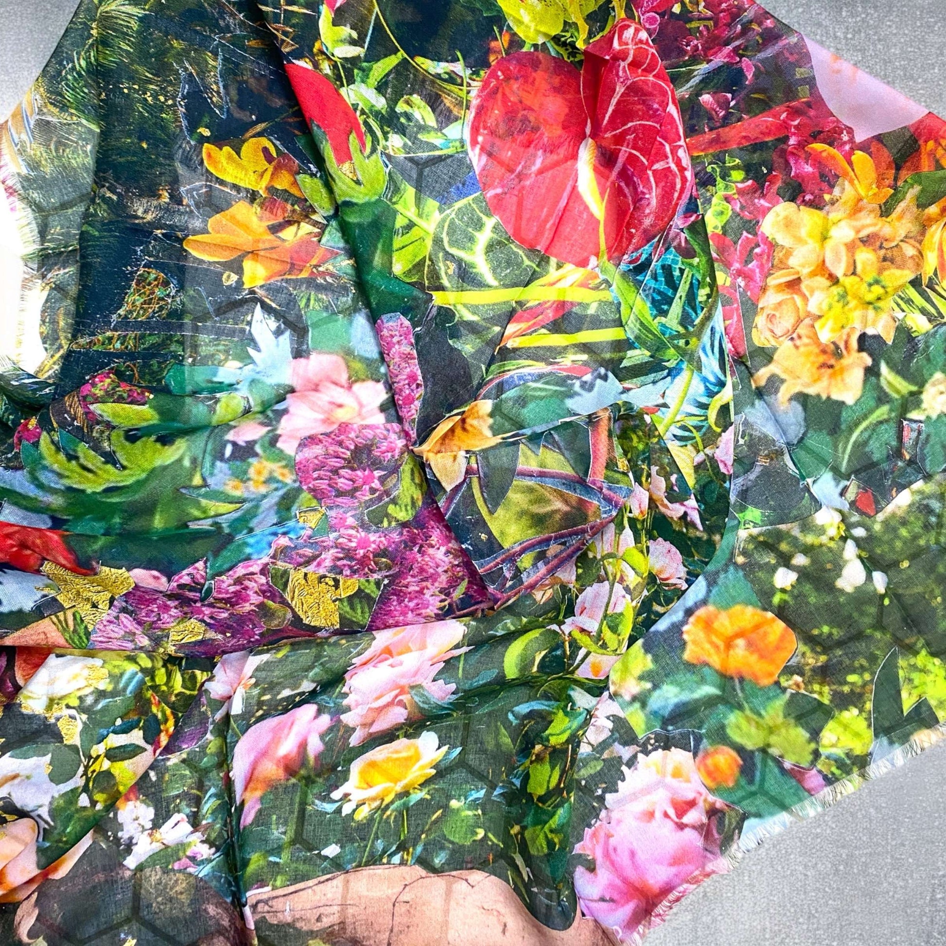 Modal 36×36 à bords effilochés, disponible en deux imprimés : « Royal Flush » et « Magic Garden ».