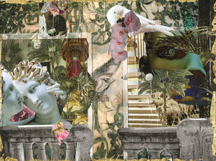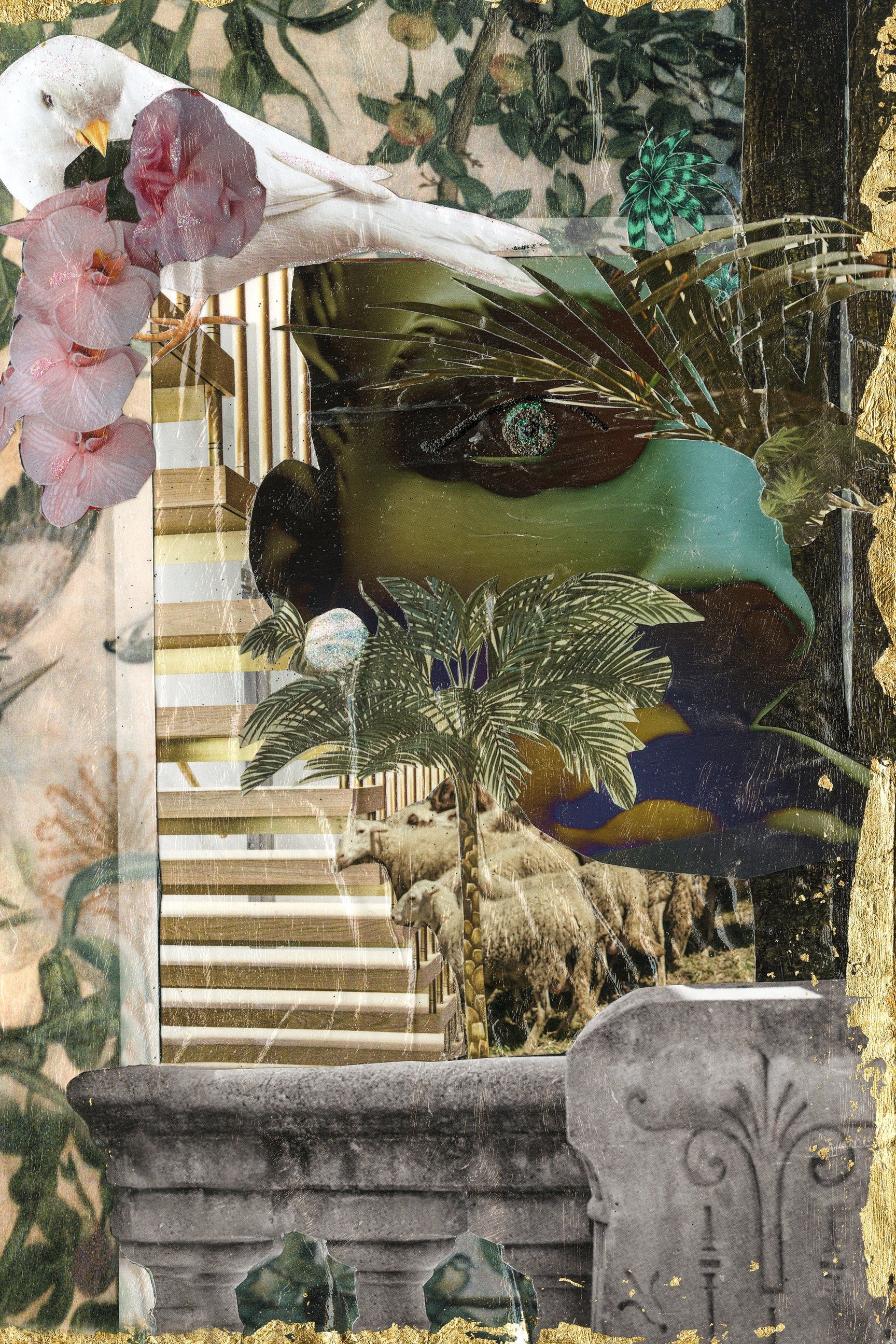 This collage is a myriad of dichotomies. It is both soft and intense. It is modern and ancient in its imagery, dark and light, bold and quiet. Allure and surprise in the imagery speak to the instinct to find and keep one’s faith in challenging situations or everyday life and how that intention requires discipline, commitment, and focus.