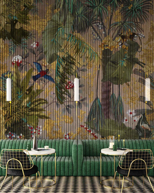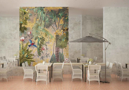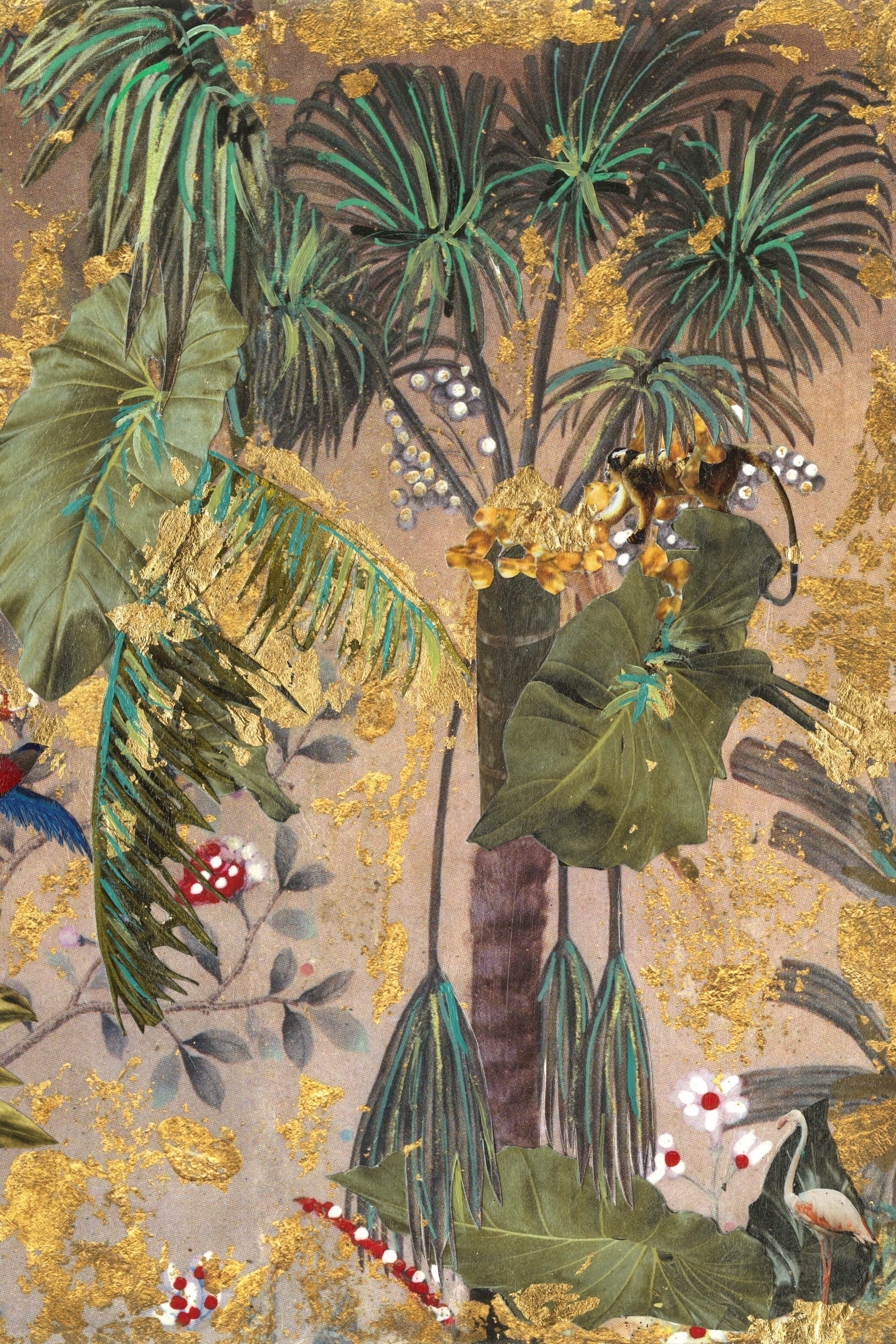 This jungle is alive, thriving, and lush, glamorous and exotic with 14K gold leafing weaving it all together. This world has elements of old and new, natural and chic, all combined in this rich, inspiring, world.